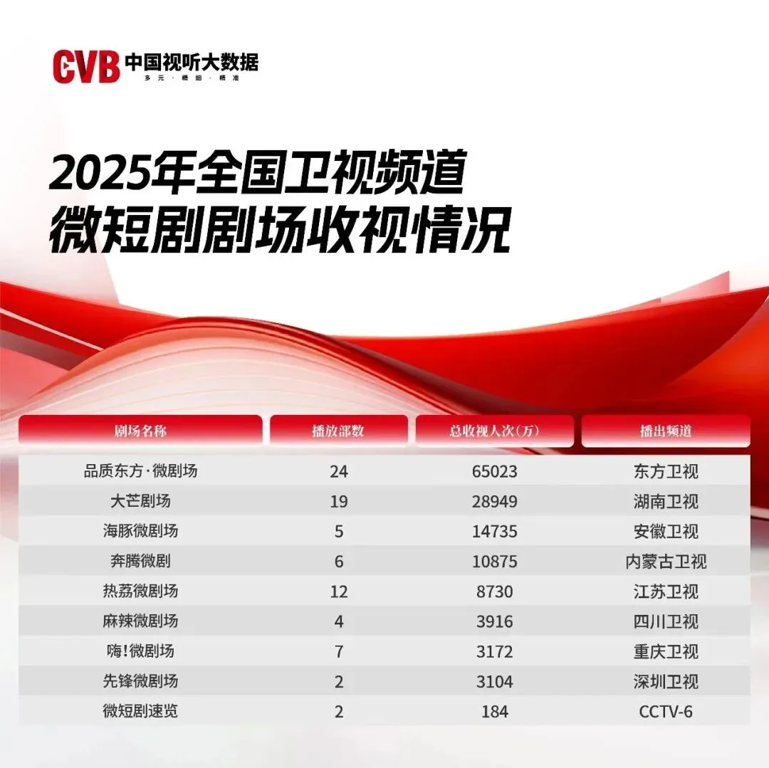 中国视听大数据(CVB)数据显示,2025年,9个卫视频道设置常态化微短剧剧场,已成为培育观众习惯、提升频道竞争力的有效模式。东方卫视“品质东方・微剧场”播出24部作品,总收视人次达6.5亿;湖南卫视“大芒剧场”19部作品,收视2.9亿人次;安徽卫视“海豚微剧场”、内蒙古卫视“奔腾微剧”收视人次均超1亿。