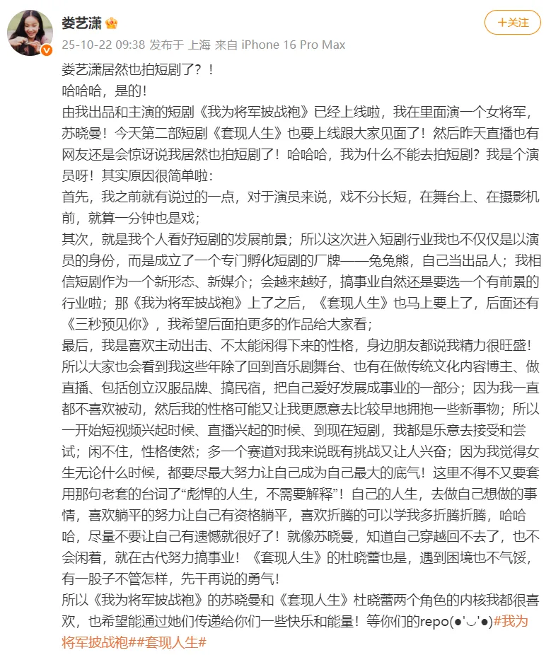 2025 年 10 月 22 日,娄艺潇在社交平台的一则发文,让 “演员跨界短剧” 话题再次升温 —— 她不仅以主演身份参演两部短剧,更亲自下场担任出品人,成立个人短剧厂牌。不同于其他明星对跨界的谨慎表态,娄艺潇直言 “演员演戏不分长短”,还引用《爱情公寓》中 “胡一菲” 的经典台词 “彪悍的人生,不需要解释” 收尾,既回应了外界可能的质疑,也尽显她一贯的果敢风格。