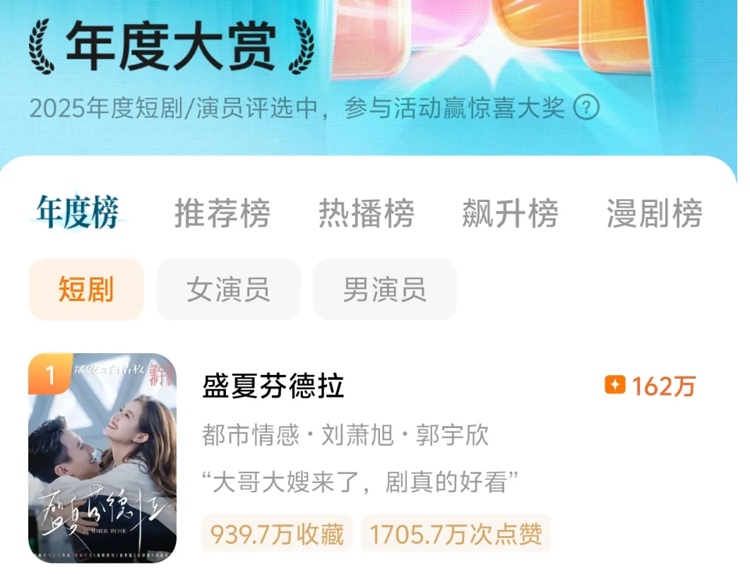 今年出现多部播放量破10亿的现象级短剧。(图/短剧《盛夏芬德拉》)2025年的年度影视黑马,只想提名短剧。
