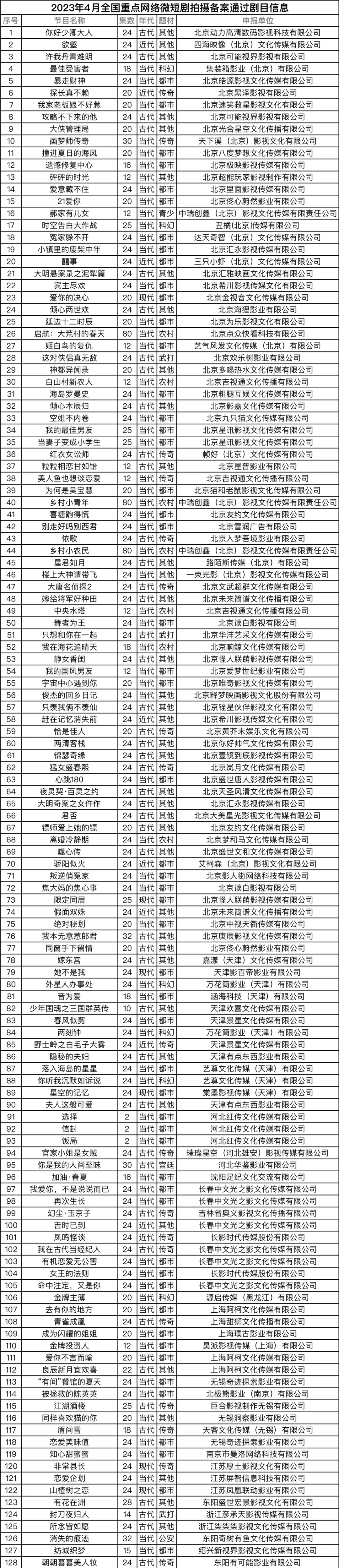 2023年4月,全国重点网络微短剧拍摄备案公示的网络微短剧共256部、6089 集。其中都市题材108部、2476 集,占比42.19%、40.66%;农村题材12部、395集,占比 4.69%、6.49%;青少题材5部、68 集,占比1.95%、1.12%;公安题材 5部、128 集,占比1.95%、2.10%;科幻题材9部、201集,占比3.52%、3.30%;传奇题材35部、853集,占比13.67%、14.01%;武打题材8部、190 集,占比3.13%、3.12%;宫廷题材2部、54 集,占比0.78%、0.89%。