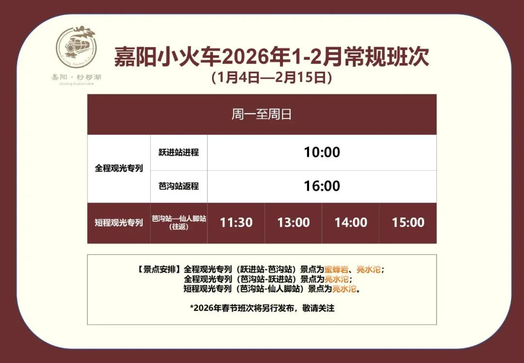 🚂 蒸汽小火车- -怀旧体验线 跃进站→芭蕉沟 ,游玩时长1.5小时左右;看点;蜜蜂岩(露天机车博物馆)、亮水沱(小火车蒸汽表演),乘车地点:跃进站。🚂 蒸汽小火车- -快捷游览线 ; 芭沟站→仙人脚站往返 ,游玩时长45分钟左右;看点;亮水沱(小火车蒸汽表演),乘车地点:芭沟站(冬季首选)。⚠️随着春节的临近,嘉阳·桫椤湖景区为了保障游客的出行安全,特此发布温馨提示,提醒广大游客拒绝乘坐非法运营车辆: