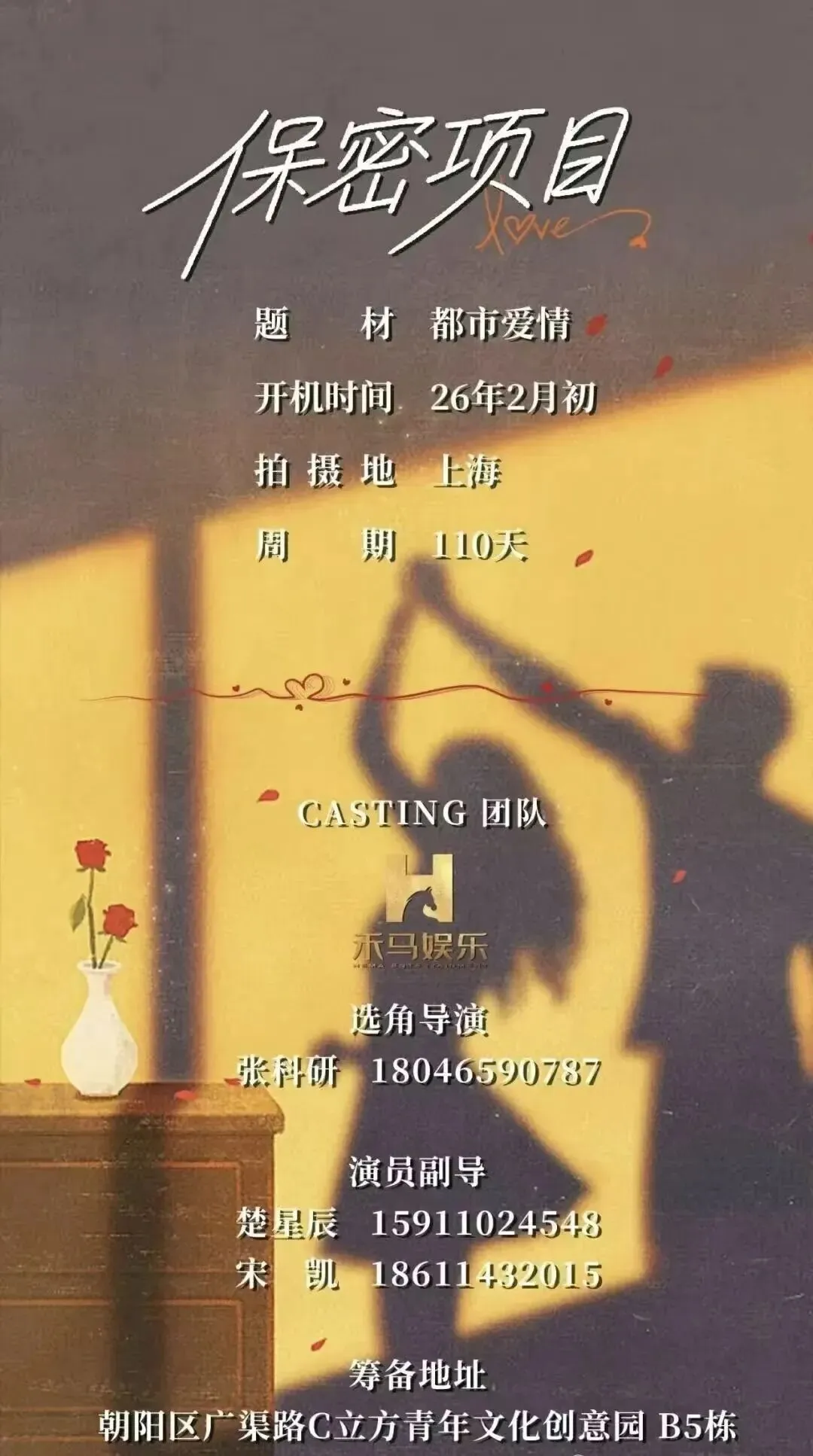 筹备地址:北京市朝阳区酒仙桥星城国际大厦B座1501室如意选角工作室