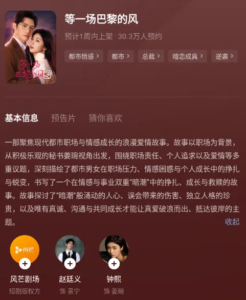 >赵廷义、钟熙主演的都市爱情短剧《等一场巴黎的风》,定档1月29日播出