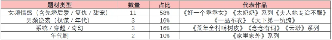 女频情感类占比58%(11部),包揽先婚后爱、复仇逆袭、甜宠治愈等核心赛道。