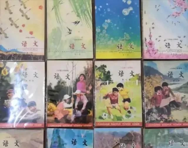 图中这些封皮都叫语文课本,纸张不厚,色彩是温柔的水粉调子,孩子们在田埂上跑,在球场上踢,在画面里笑着往前冲,角落里一行小字告诉你是六年制小学课本,我们当年领书的那天,班主任在讲台上按册数往外发,手指头一勾一捏,封皮轻轻一划拉,熟悉的两个红字一亮,心里跟着亮了。