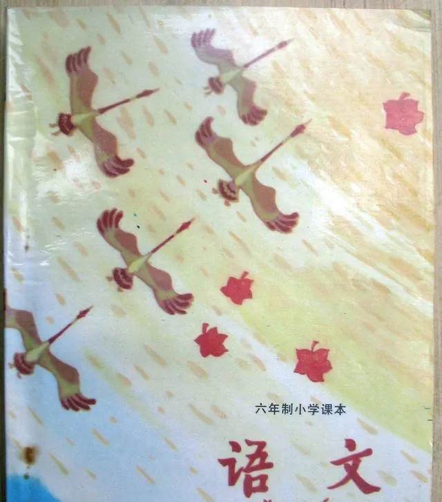 这个封面上是成排的雁阵,斜斜飞过黄灿灿的空,旁边几片红叶顺风打着转,颜色淡而不闷,像刚晒过的被面,妈妈说这本是春末领到的,开学第一周她就给我用牛皮纸包了个书皮,说别折了角,坐在窗边那点斜阳照上去,封面上的雁就像要飞出纸面一样。