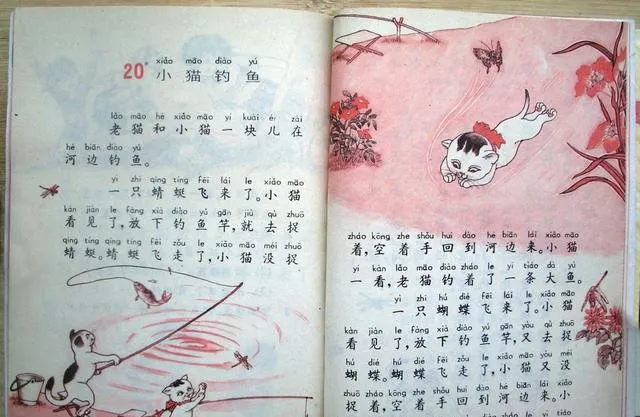 这页叫小猫钓鱼,粉红的水波团成一圈,小猫蹲在岸边,竿子压着水面,字大而方正,拼音顶在字头上挨挨挤挤,老师让我们起立齐读,老猫一抬眼,我在底下和同桌偷笑,回家背到一半还想摸鱼,这篇一学完,奶奶就说看书别心猿意马,写完作业再下河边,后来真的下去了,结果鱼没钓着,裤腿倒是湿了半截。