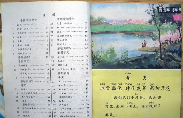这页有目录,有一幅小水塘的画,旁边写着春天两字,冰雪融化四个小黑点顶着注音,读到这里就想把窗子推大一点,操场上泥还潮着,跳皮筋的喊一二三,队伍散开又合上,那时的我们认字不快,心里却早把春天认全了。