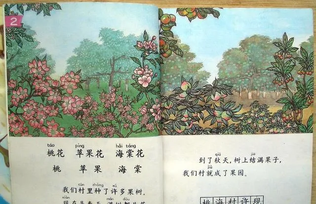 图里的花叫桃花苹果花海棠花,粉的挤着红的,绿叶从纸背后冒出来,句子短,节气长,到了秋天树上结满果子,书上这么写,家里也这么过,爸爸挑着筐从山坳里回来,拿起书替我念两句,说行啊你们书上都画上了,这年头的画不骗人。