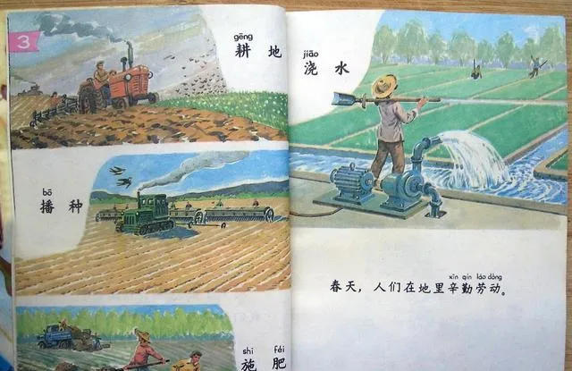 这几幅小格子讲的是春耕,拖拉机把地翻得一垄一垄,水泵嘴子一扬白练子就起了,撒种施肥都有样子,老师让我们指图说话,我举手先来,学着大人的腔儿说春天人们在地里辛勤劳动,底下有人笑,说你小嘴抹了蜜,放了学我跟着外公去田埂边看真的水泵,轰轰响得厉害,鞋面上全是泥点子。