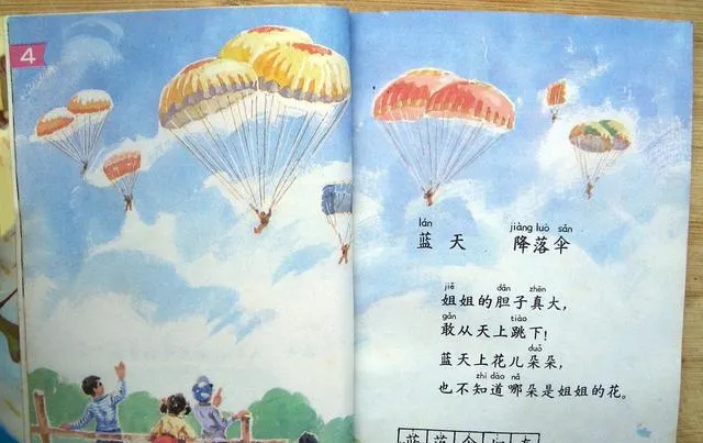 这页的名儿很好听,蓝天降落伞,几朵伞花开在空里,橙的黄的一团一团往下飘,小伙伴把书举到头顶模仿跳伞,一脚从凳子上迈下来,差点给老师逮住,姐姐说伞花像棉花糖,我却觉得更像操场边那几朵晚霞,甜是甜,可也抓不住。