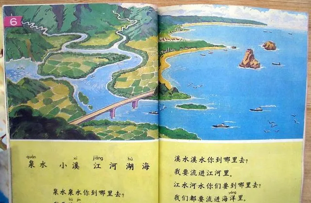 这张画问你泉水小溪江河湖海要去哪,蓝蓝的水像拉长的丝带,桥从上头跨过去,岸边点着几只小白帆,我第一次读就跟着念要流进江河里,我们都要流进海洋里,这一句被老师画了波浪线,她说这话有股子开阔劲,后来每次出远门,车窗外水面一亮,我都在心里把这句给念一遍。