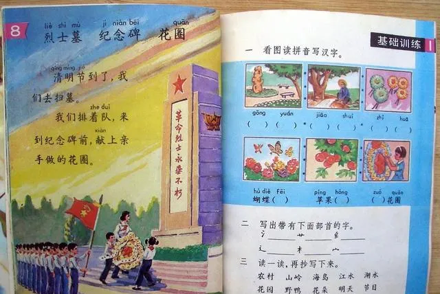 这一页左边去烈士墓献花圈,右边是基础训练的拼音卡片,红旗在风里立得直直的,小队长抱着花圈走在前头,我站在队伍里心跳得厉害,不敢眨眼,老师说队形要齐,脚跟点地要同时,回到教室抄生字,铅笔尖子蹭蹭蹭冒灰,桌洞里那块橡皮被我捏得发亮。