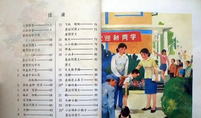 这张迎新同学的插画一出来就热闹,门口挂着横幅,老师笑着弯腰摸学生的头,背后有人从台阶上蹦下来,目录把一学期的日子全写在上面,看着就踏实,我们那会儿换了新书会先翻到目录找那一篇,谁先学到谁先在走廊里哼两句,像占了什么便宜似的。