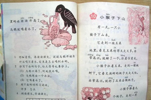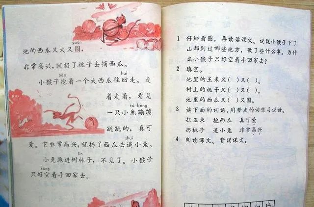 小猴子下山这几页翻得最勤,字旁边的小红画从头跳到尾,西瓜大又圆,桃子红又甜,读着就馋,老师问小猴子为什么到最后没拿着什么,我当时答不上来,只觉得它跑得欢,手里却越抓越空,后来长大路走得多了,才懂这题不难,难在你得舍得。