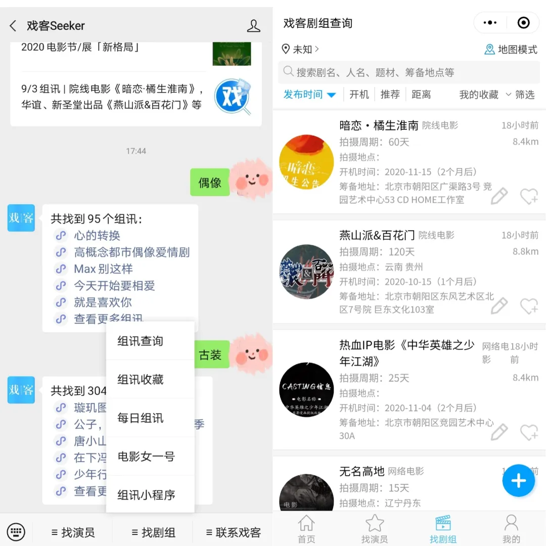 点击戏客左下角小键盘,输入片名等关键词,可以自动回复相关组讯以及人物小传。