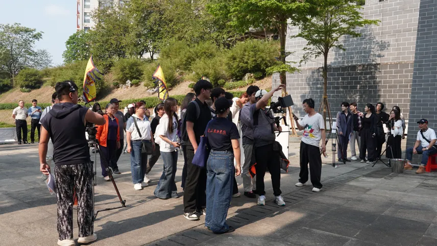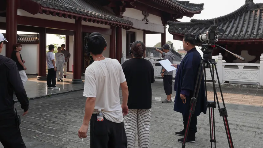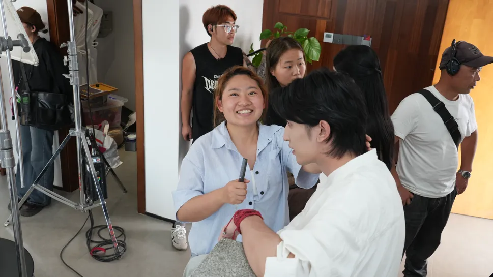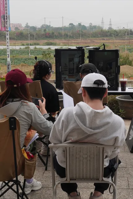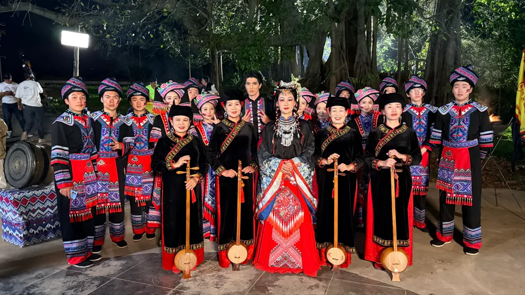 镜头之外,《问锦》的日常同样鲜活动人, 夜色里的壮乡古榕下,身着非遗服饰的演员们手持天琴、围站成圈,斑斓壮锦纹样与铜鼓相映,定格下八桂大地的烟火与热忱;片场一隅,化妆师正为演员细致整理妆发,这些日常剧照里,有创作的专注,有文化的传承,更有一群人对《问锦》的赤诚热爱。