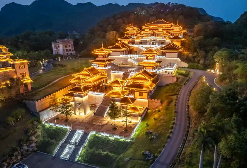 这里不仅是《问锦》开机仪式的举办地,更是剧中承载骆越文化、传递壮族精神的核心场景。这座矗立在花山温泉旅游度假区的唐式建筑群,258级台阶串联起七个平台,骆越王大殿的庄严与岩画元素的巧妙融入,完美契合剧中“织命师”传承千年文化、坚守道义的设定。剧中祭祀、祈福等场景将在此取景,让观众在剧情中,沉浸式感受骆越先民的文化底蕴与壮族儿女的根祖情怀。