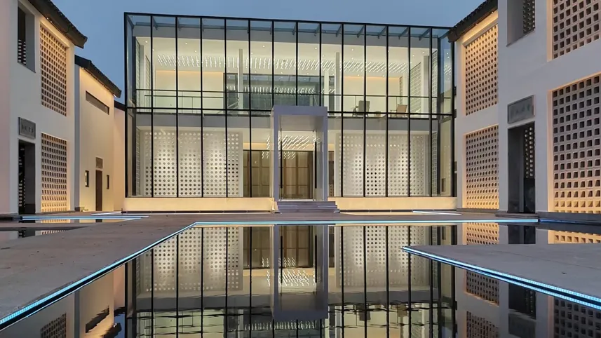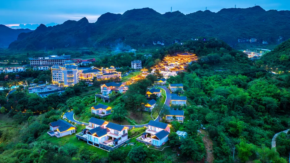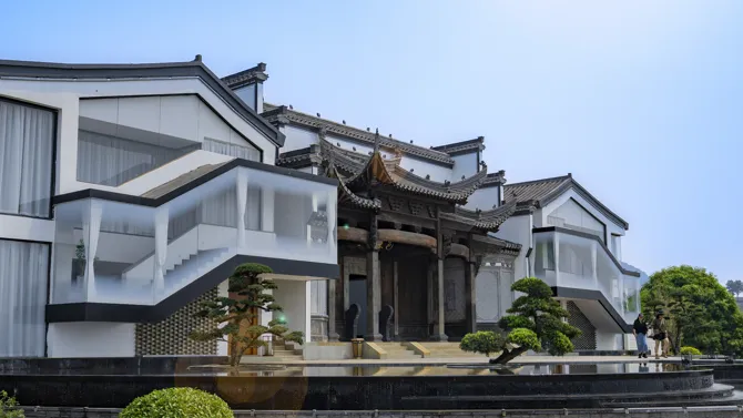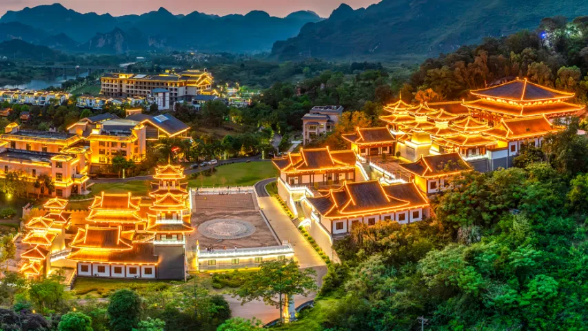 骆越山庄民宿藏着壮乡的烟火气,木质结构、民俗装饰,恰是剧中黎央央体悟人间真情、感受家常温暖的理想场景,那些关于亲情、守护的细腻戏份,将在这里温情上演;而笙美度假村则自带山水诗意,镜面水围合的合院建筑、与花山岩画隔江相望的景致,完美适配剧中人物修行、蜕变的静谧场景,度假村内的壮锦香囊制作、铜鼓拓印等非遗体验,更将自然融入剧情,让壮族文化可看可感。