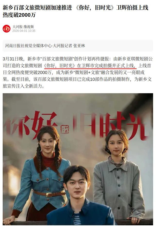 3月31日晚,新乡市“百部文旅微短剧”创作计划再传捷报:由新乡亚琪微短剧公司打造的文旅微短剧《你好,旧时光》在卫辉市完成拍摄并正式上线,上线首日全网热度便突破2000万,成为新乡“微短剧+文旅”融合发展的又一亮眼成果。截至目前,该百部文旅微短剧项目已完成10部作品的拍摄制作,为新乡文旅宣传注入全新活力。