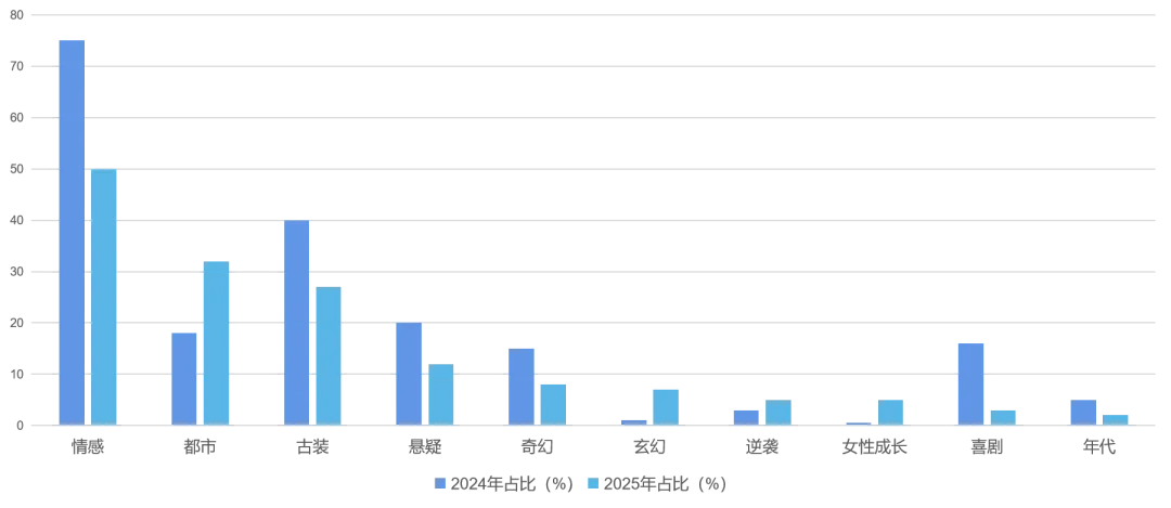 从短剧热播类型来看,情感题材虽仍居榜首,但占比从2024年的75.3%大幅降至2025年的49.7%;都市、玄幻、逆袭、女性成长等题材占比显著提升,其中都市题材从17.9%跃升至32.1%,女性成长题材从0.5%增至5.1%,而古装、悬疑、奇幻、喜剧、年代等题材占比则有所回落,整体反映出微短剧题材结构从情感主导向多元分化、现实向与女性向题材崛起的趋势。
