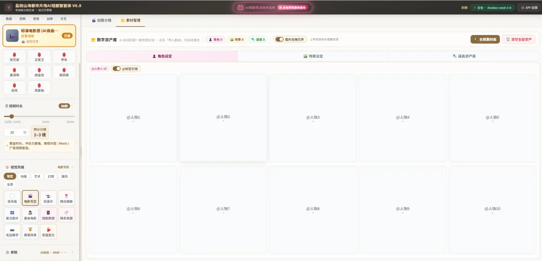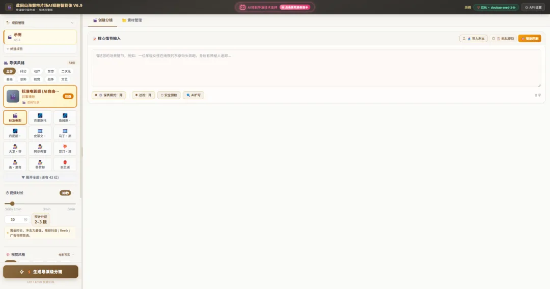 5. 从一句话到完整分镜,创意落地零门槛。这是V6.9版本最具革命性的突破!你只需:导入完整剧本或者输入一个简单的故事描述,甚至只是一个核心创意点AI就能自动完成:专业剧本创作/精准分镜设计/人物形象设定/场景与道具设计等,自动生成所有元素的AI绘图提示词,一键生成对应参考图片。