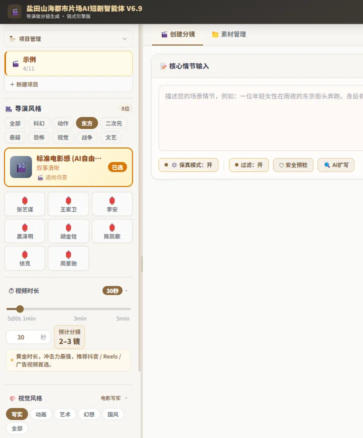 3.导演风格,一键复刻大师水准, 9大类别50多位导演风格供你选择。我们深度分析了全球顶尖导演的创作手法,打造了涵盖科幻、动作、东方、二次元、悬疑、恐怖、视觉、战争、文艺9大类别,包含50多位知名导演的风格模板。只需一键选择,AI就能精准复刻对应导演的叙事节奏、镜头语言和情绪表达,让你的作品瞬间拥有大师级质感。