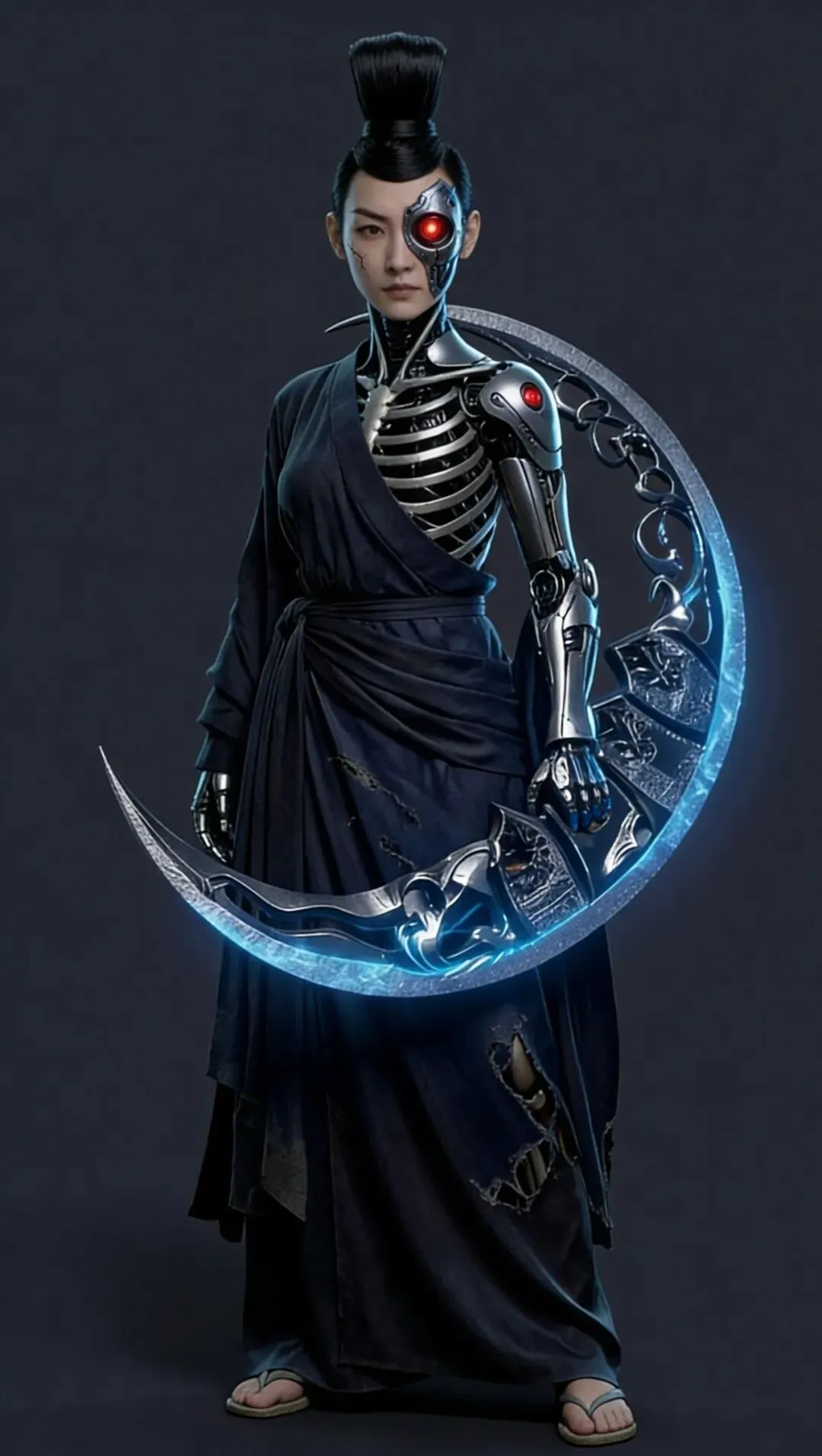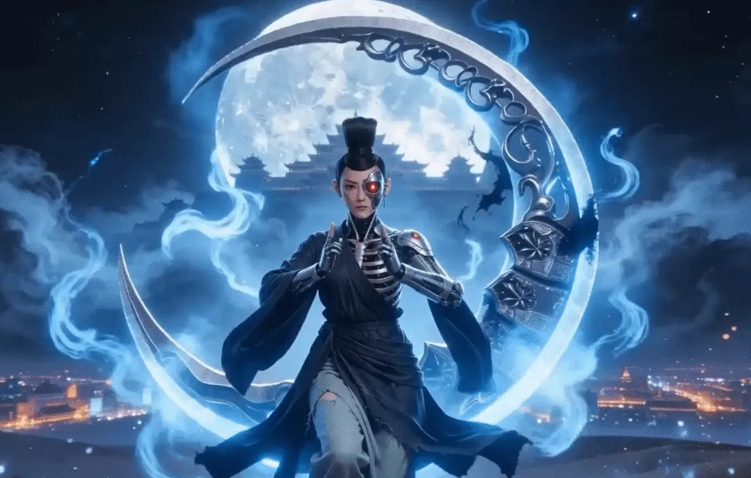 先简单介绍一下这个项目:《月刃·觉醒》是一个 9 集竖屏短剧,每集 10 秒,讲的是少女孤月被神秘组织"影月盟"改造为半机械武器,在赛博朋克世界"影月城"中寻找自我身份的故事。风格上我往"徐克武侠+赛博朋克"的方向靠——一个半人半机的姑娘背着一把狮头新月刃,在霓虹灯和古建筑之间寻找自己到底还算不算"人"。点击下方图片可播放查看完整短剧。