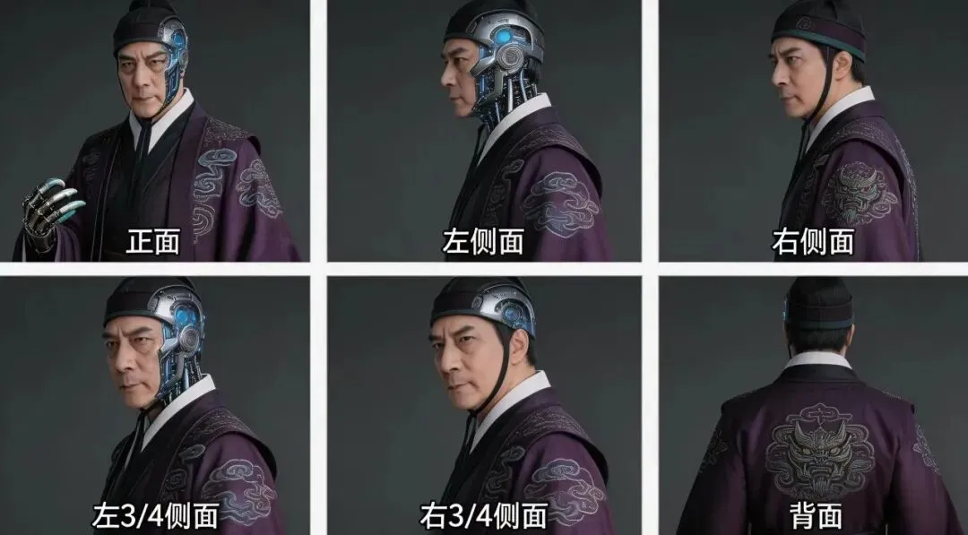 这一步我踩了无数的坑。 AI 第一次给我生成的孤月,光头、穿着袈裟、手里拿着禅杖——我说这是赛博武侠,它给我整了个赛博和尚。还有一次更离谱,孤月的脸半边是骷髅半边是金属,活像个赛博女鬼。来来回回改了七八版提示词,才终于让 AI 理解我要的是"浅绿古装纱衣+红色义眼+半机械身体"这个造型。