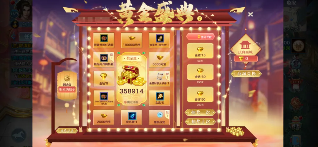 每次抽奖都会获得随机数量的【金钻】,少侠可在庆典商店兑换各类心仪道具奖励!