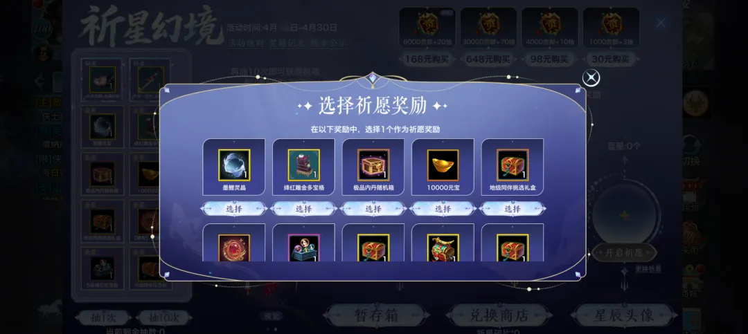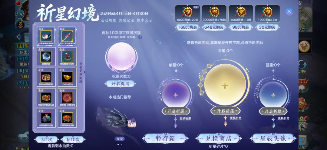 少侠可通过购买礼包获取祈愿次数,抽取奖励前可先自定义选择金蓝紫三种祈愿奖励,集齐5颗金星必得金星祈愿,集齐3颗紫星必得紫星祈愿,集齐2颗蓝星必得蓝星祈愿,祈愿奖励直接发放至背包、