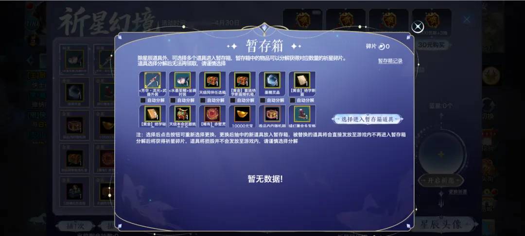 每次祈愿获得的道具会先放入暂存箱,少侠可根据自身需求条则领取或分解成祈星碎片。