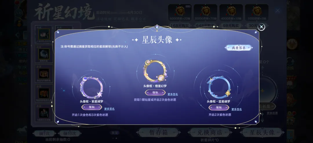 获得指定数量的星辰后,少侠还可以获得本次的限时星辰头像框,可自定义签名内容哦~